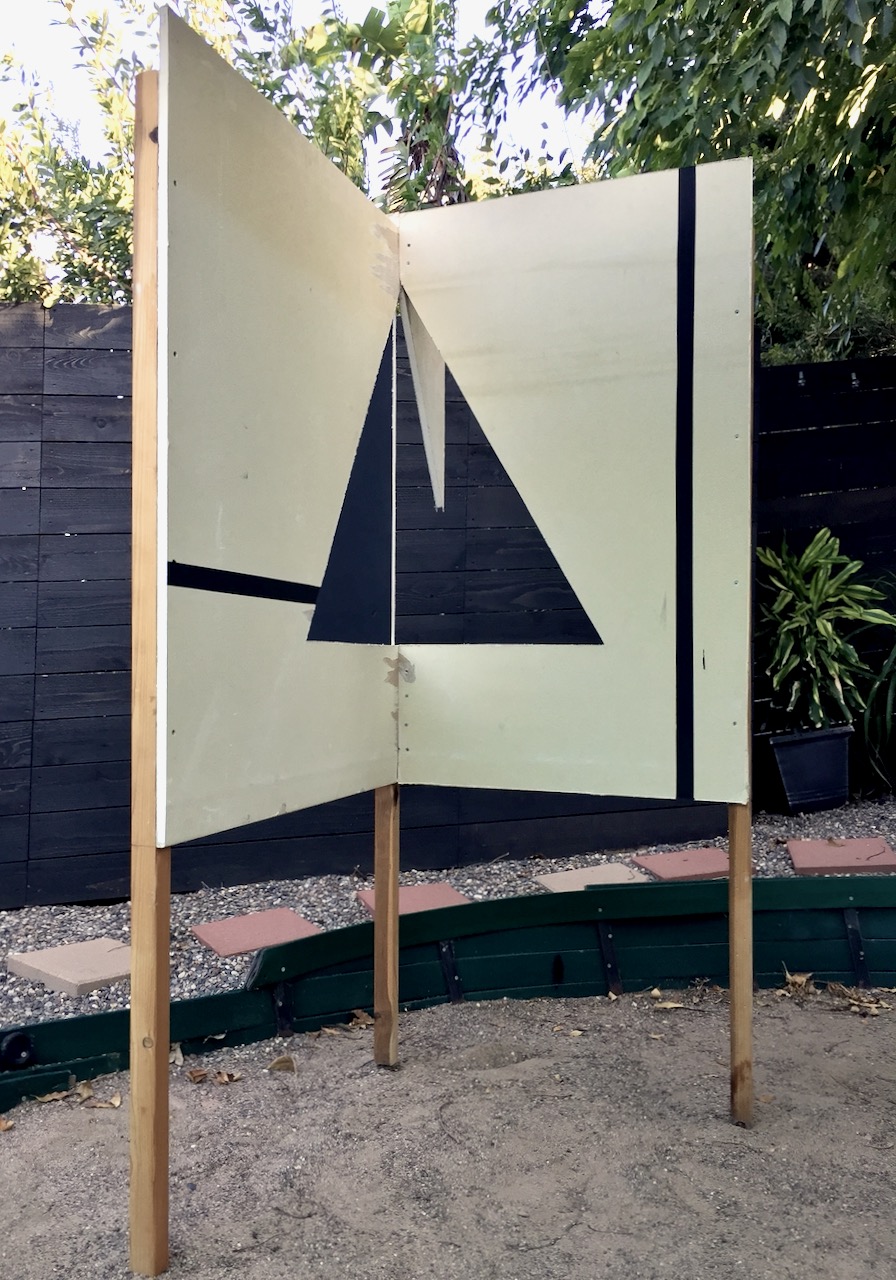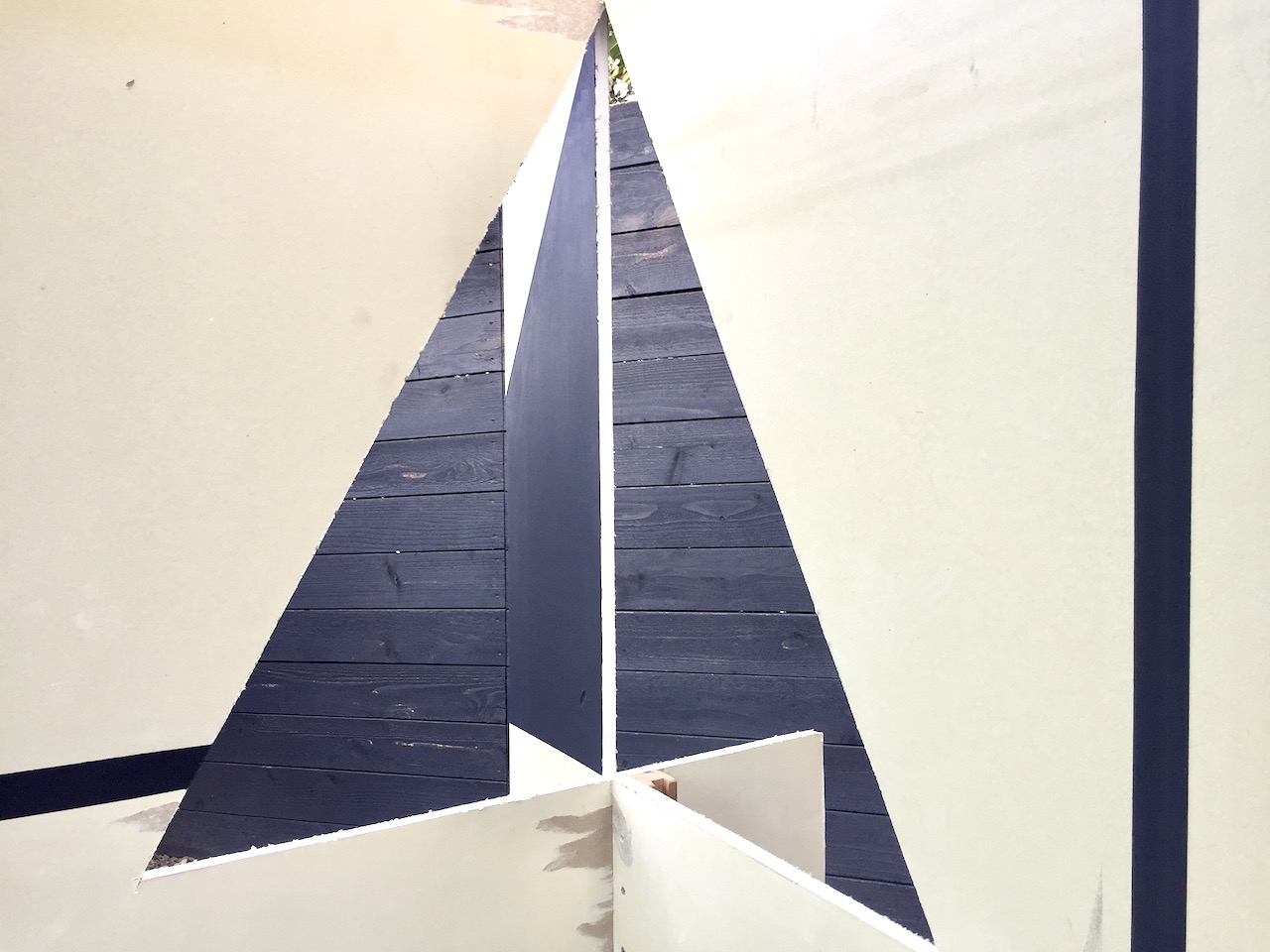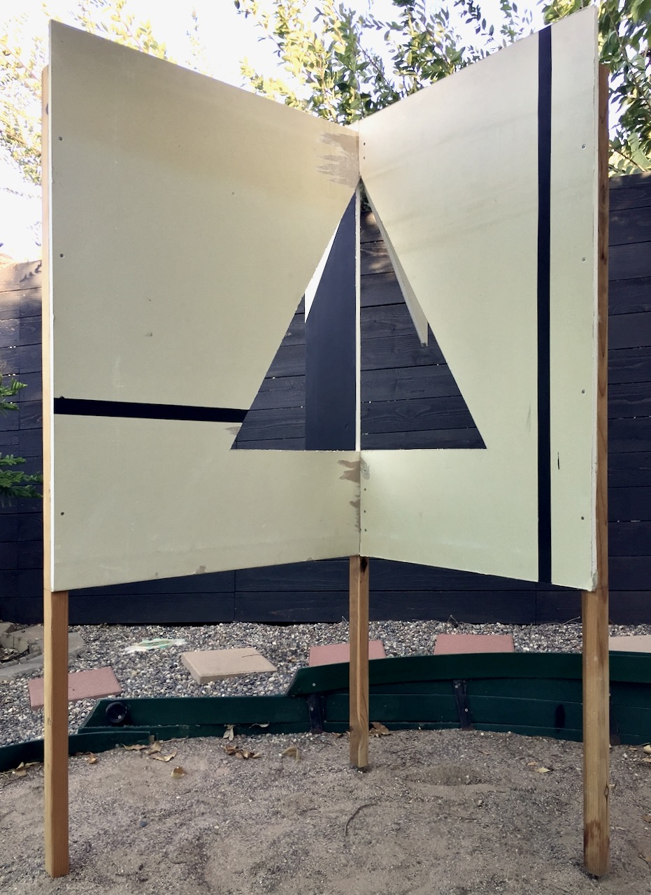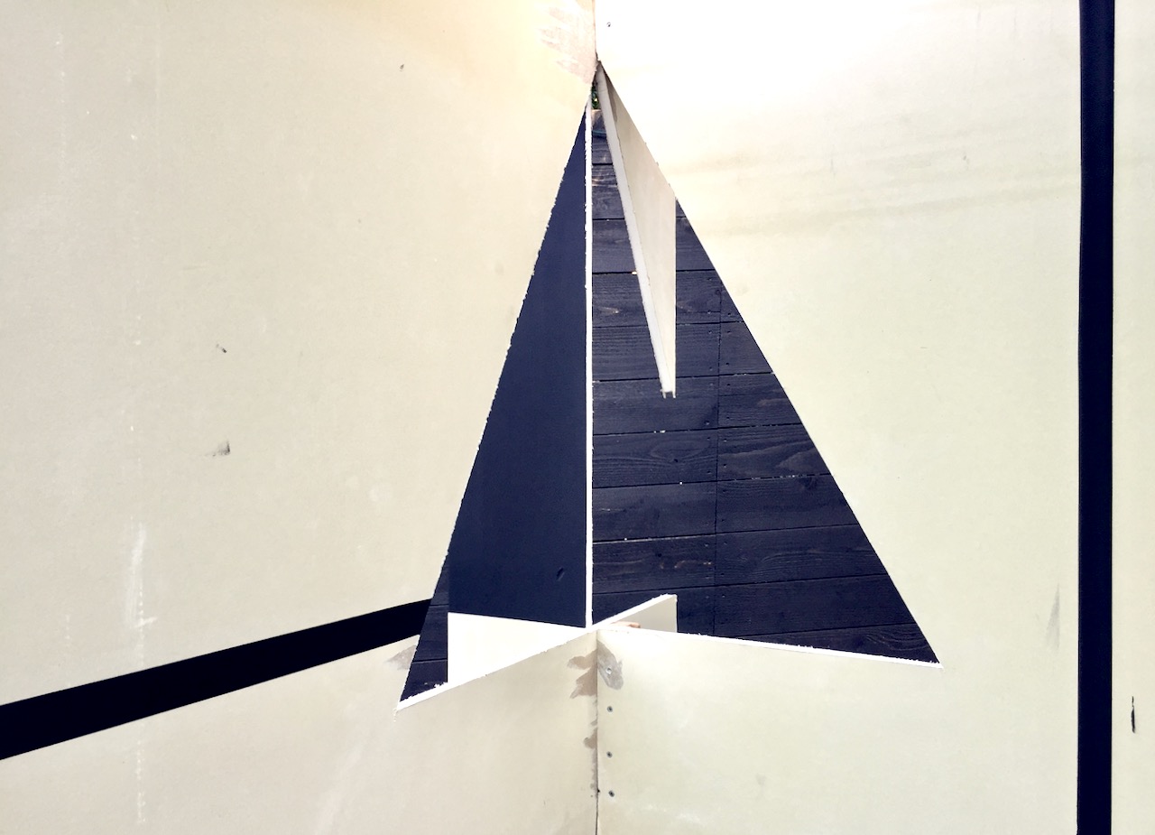 SITE-SPECIFIC SCULPTURE. Drywall, wood, steel, black gesso. 6 ft. x 4 ft. x 3 ft. (approx.)
