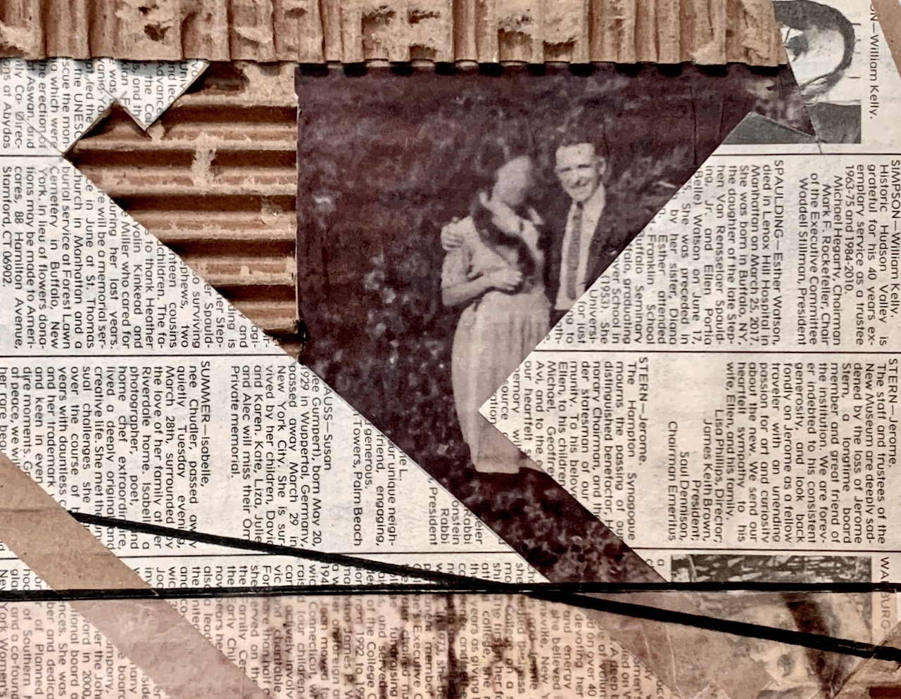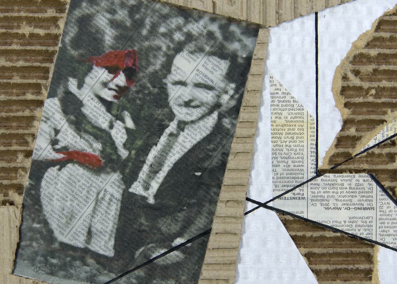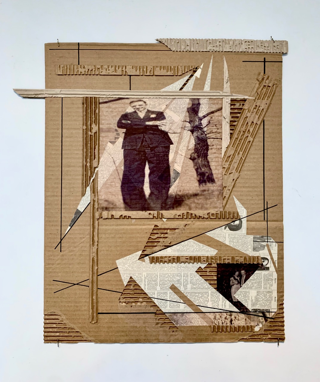 COLLAGE. Corrugated, newsprint, appropriated photographs and maps printed on tissue paper and vellum (inkjet), acrylic ink, archival ink marker. Memoria corrugata-A [window], 22.5 in. x 19.25 in; Memoria corrugata-B [two couples], 22.5 in. x 20 in; Memoria corrugata-C [Nagy-Karoly], 8.5 in. x 13 in.; Memoria corrugata-D [Pressburg], 8 in. x 14 in.