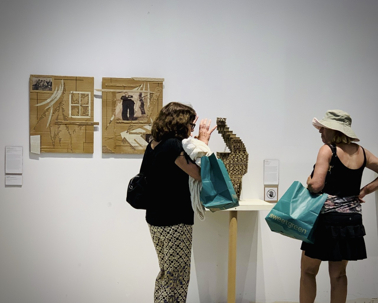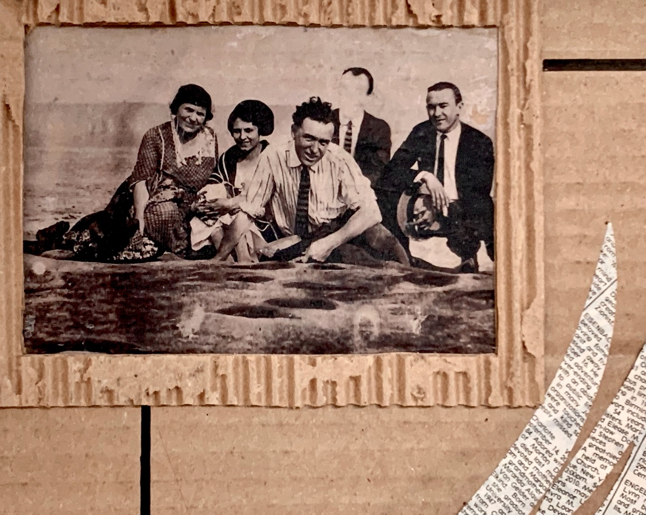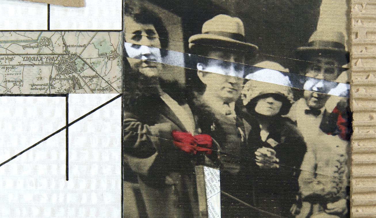 COLLAGE. Corrugated, newsprint, appropriated photographs and maps printed on tissue paper and vellum (inkjet), acrylic ink, archival ink marker. Memoria corrugata-A [window], 22.5 in. x 19.25 in; Memoria corrugata-B [two couples], 22.5 in. x 20 in; Memoria corrugata-C [Nagy-Karoly], 8.5 in. x 13 in.; Memoria corrugata-D [Pressburg], 8 in. x 14 in.
